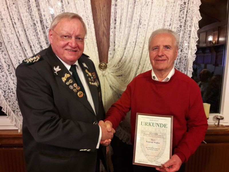 Dann stand ein äußerst angenehmer Tagesordnungspunkt an, die Ehrungen. Eine besondere Ehrung erhielt Gilde- und Ausschussmitglied Konrad Walter (siehe Bild). Er konnte das Bezirksehrenkreuz Stufe 3 (Grün) des Bezirks Neckar entgegennehmen. Dies ist eine der höchsten Auszeichnungen des Bezirks für Schützen, die nicht dem Kreis- oder Bezirksschützenmeisteramt angehören. Geehrt wurde er unter anderem für sein außerordentliches Engagement bei den baulichen Aktivitäten, bei denen er die Bauleitung und -aufsicht übernahm.