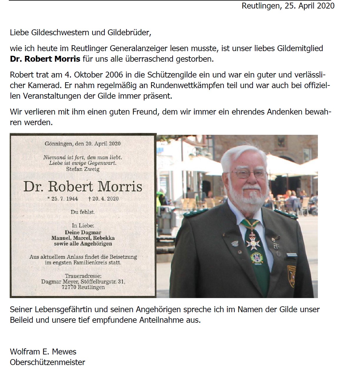 Die teilnehmenden Gildemitglieder werden gebeten, im Gildeanzug zu erscheinen, ohne Handschuhe und Hut. Die einzuhaltenden coronabedingten Abstandsregeln bitte beachten.